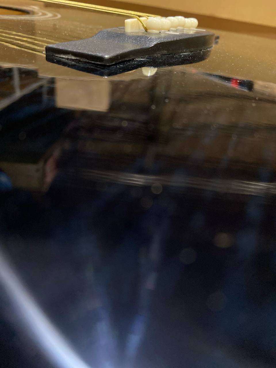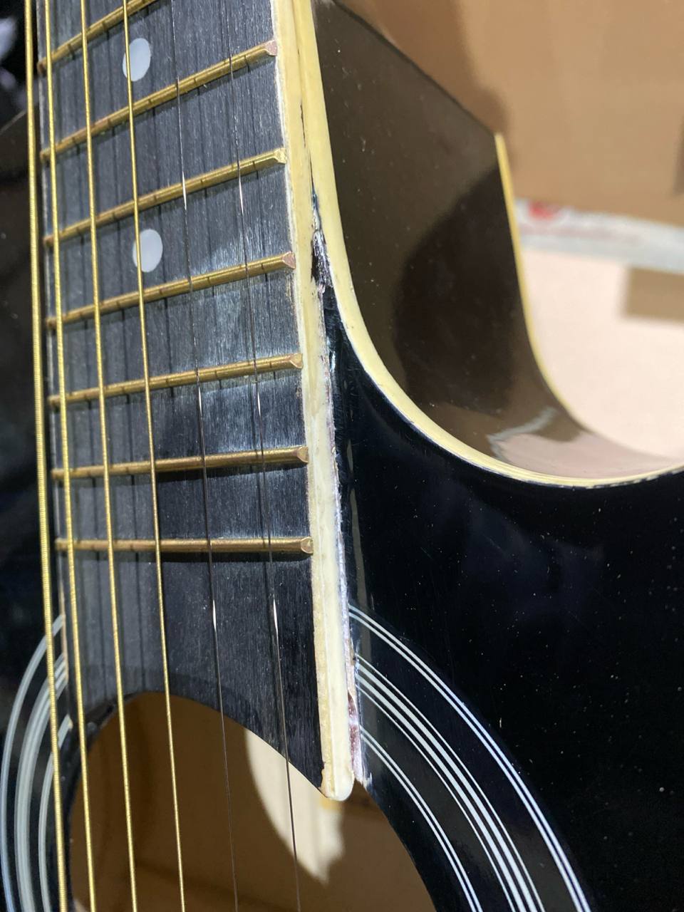 Отходит бридж, трещина на пятке грифа, дефекты ЛКП, высоко струны