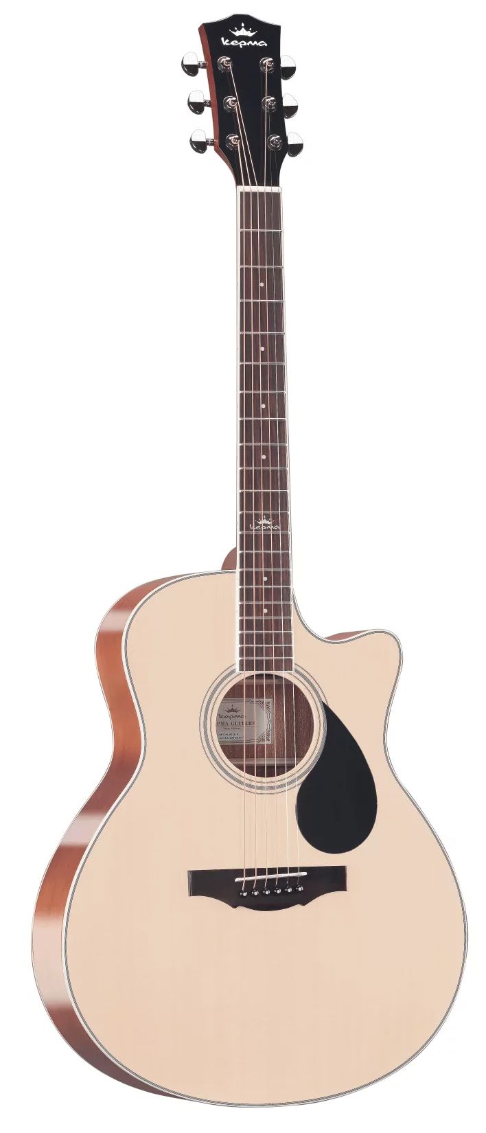 Недорогая акустическая гитара с корпусом Grand Auditorium, обеспечивающая оригинальный и сбалансированный акустический голос с акцентом на средние и высокие частоты. Инструмент хорошо подходит для игры пальцами, фингерстайла, а также для игры медиатором и боем средней силы. Верхняя дека гитары Kepma A1C сделана из ламината ели, делая звук ярким и звонким. Нижняя дека и обечайки выполнены из ламината махагони, который привносит в звук теплоту и объем. Низкая постановка струн и тонкий гриф предлагают комфорт при игре, а вырез на корпусе обеспечивает удобный доступ к верхним ладам для исполнения пассажей и мелодий.