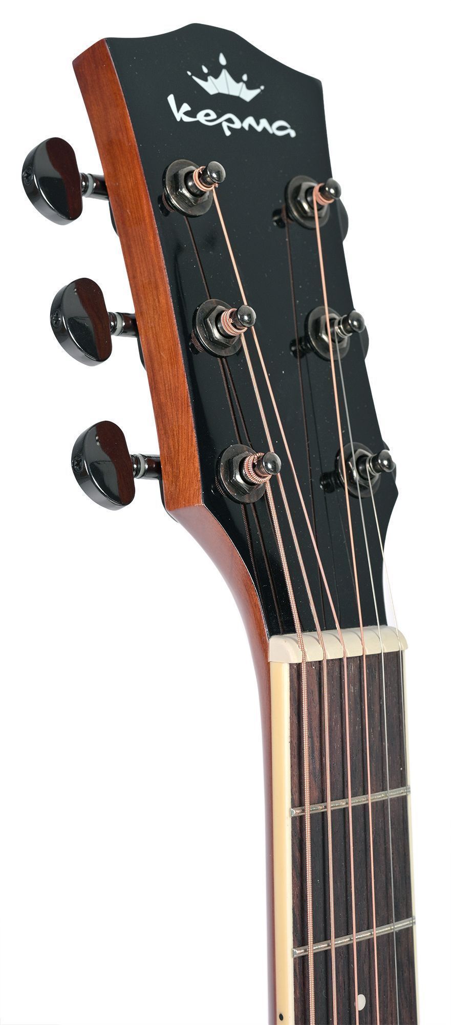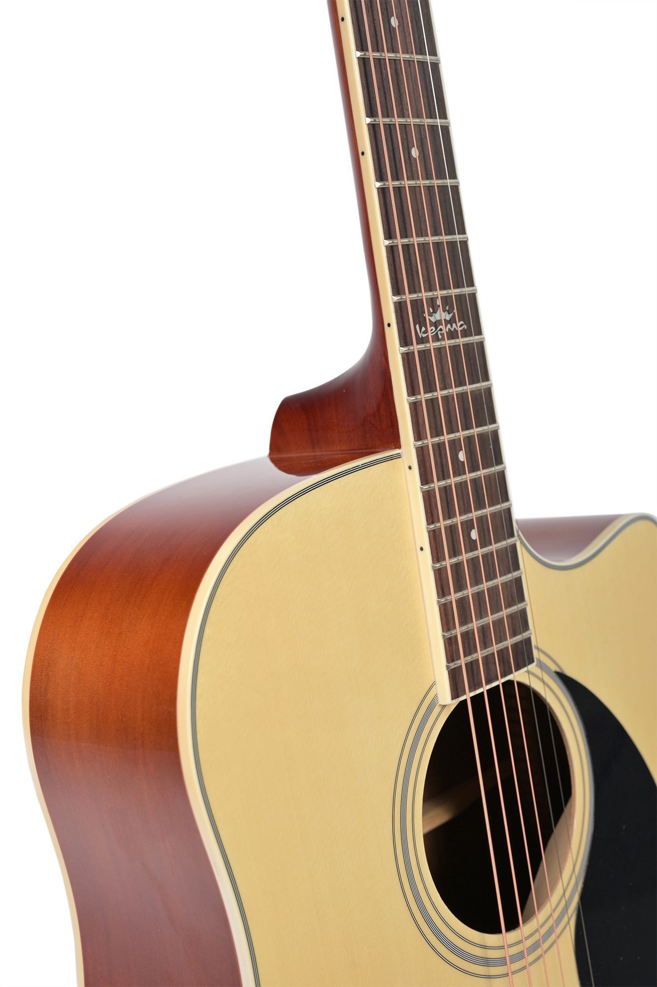 В гитаре Kepma D1C используется одна из классических «формул» древесины – верхняя дека из ели, нижняя дека и обечайка – из агатиса. Для корпуса используется многослойная древесина – она проще в обработке, абсолютно стабильна и неприхотлива к перепадам влажности и температуры. Такую гитару можно без опасений взять с собой на природу и в дорогу. Гриф гитары выполнен из красного дерева, и имеет современный тонкий профиль C-Shape – это значительно повышает удобство игры и упрощает процесс обучения. Накладка грифа выполнена из цельного палисандра.