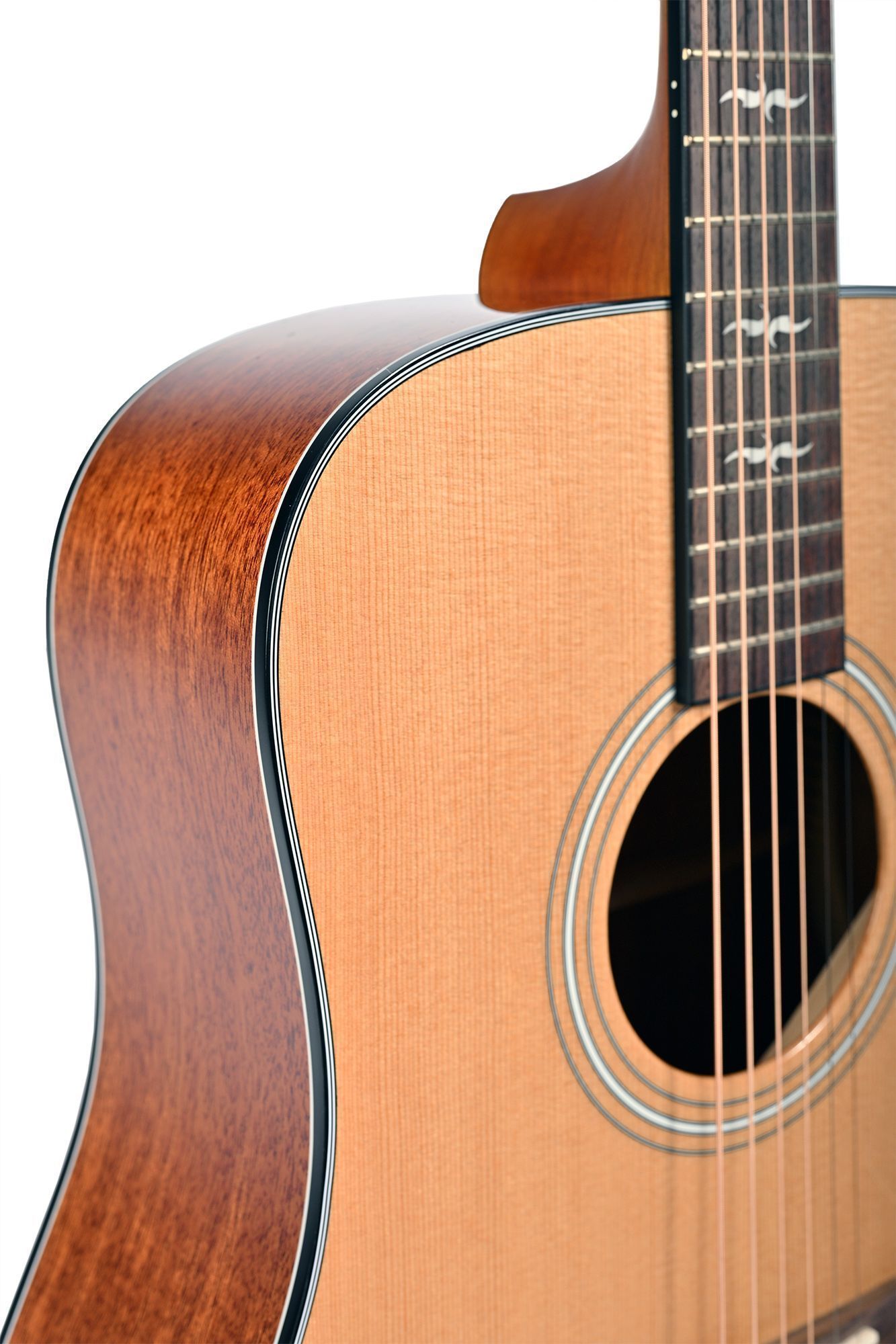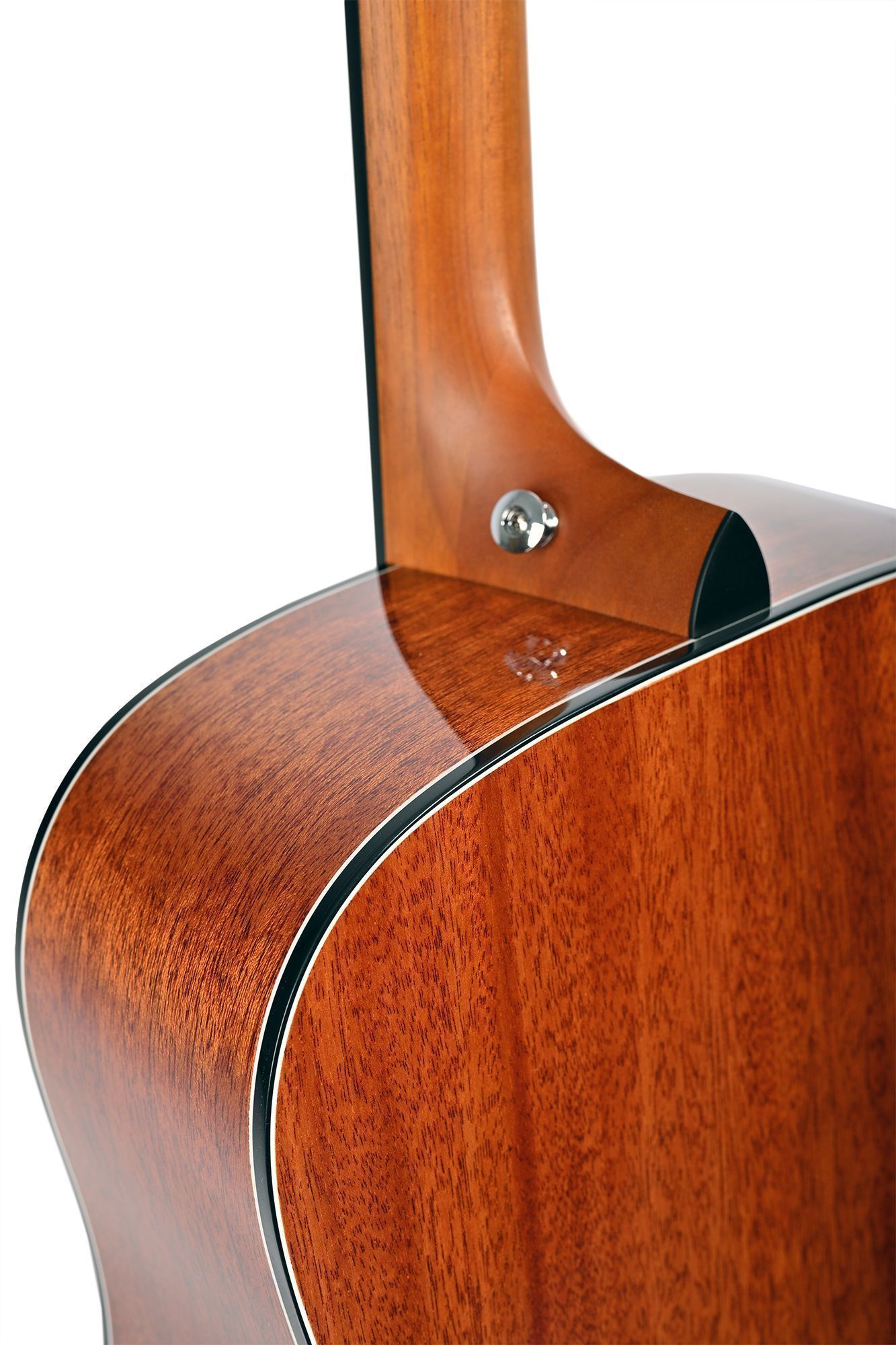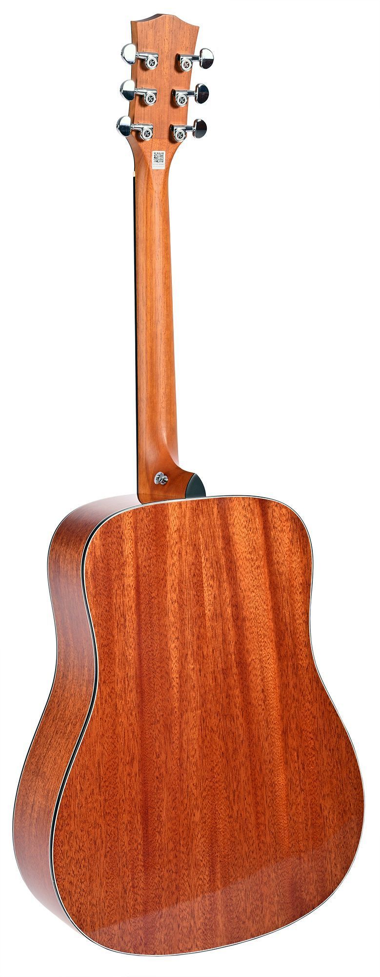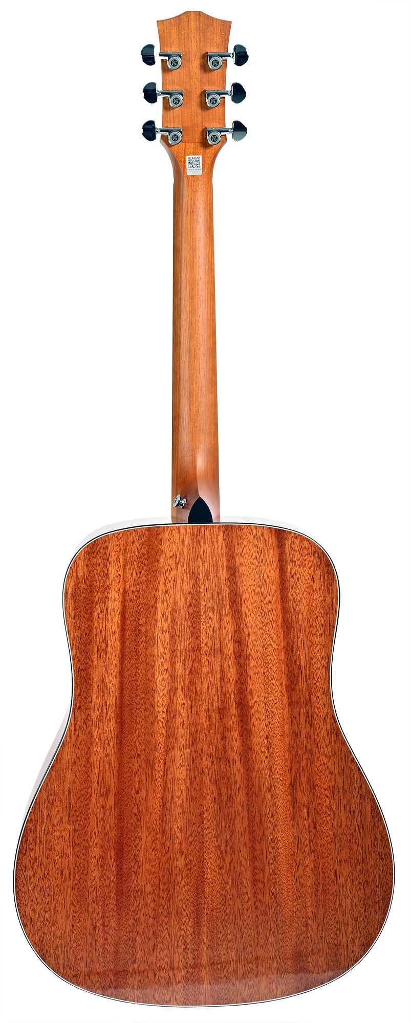 Модель выполнена в корпусе Dreadnought и отличается сбалансированным и объемным звучанием с мощными басами, выпуклыми средними частотами и сильными, чистыми верхними нотами.