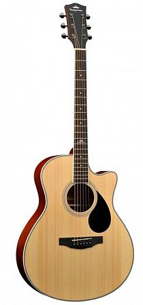 Верхняя дека инструмента выполнена из ели, нижняя дека и обечайка из. Гриф изготовлен из махагона, накладка из палисандра. Бридж из палисандра, компенсированный. Окантовка верхней деки, нижней и обечайки из черного ABS пластика. Гитара оснащена надежной хромированной колковой механикой.