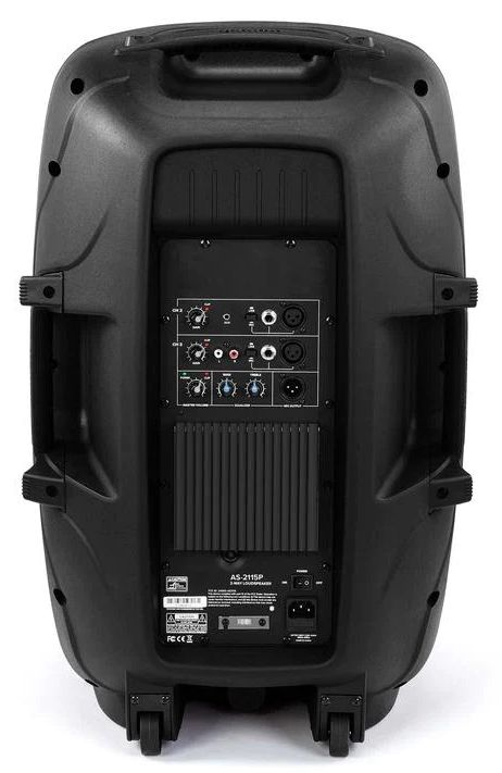 Портативная акустическая система AS-2115P имеет 2 входных канала с отдельными регуляторами усиления. На каждом доступен линейный вход jack 6.3 и микрофонный XLR, с переключателем для их смены. А также на каждом есть дополнительные входы RCA и 1/8" AUX.