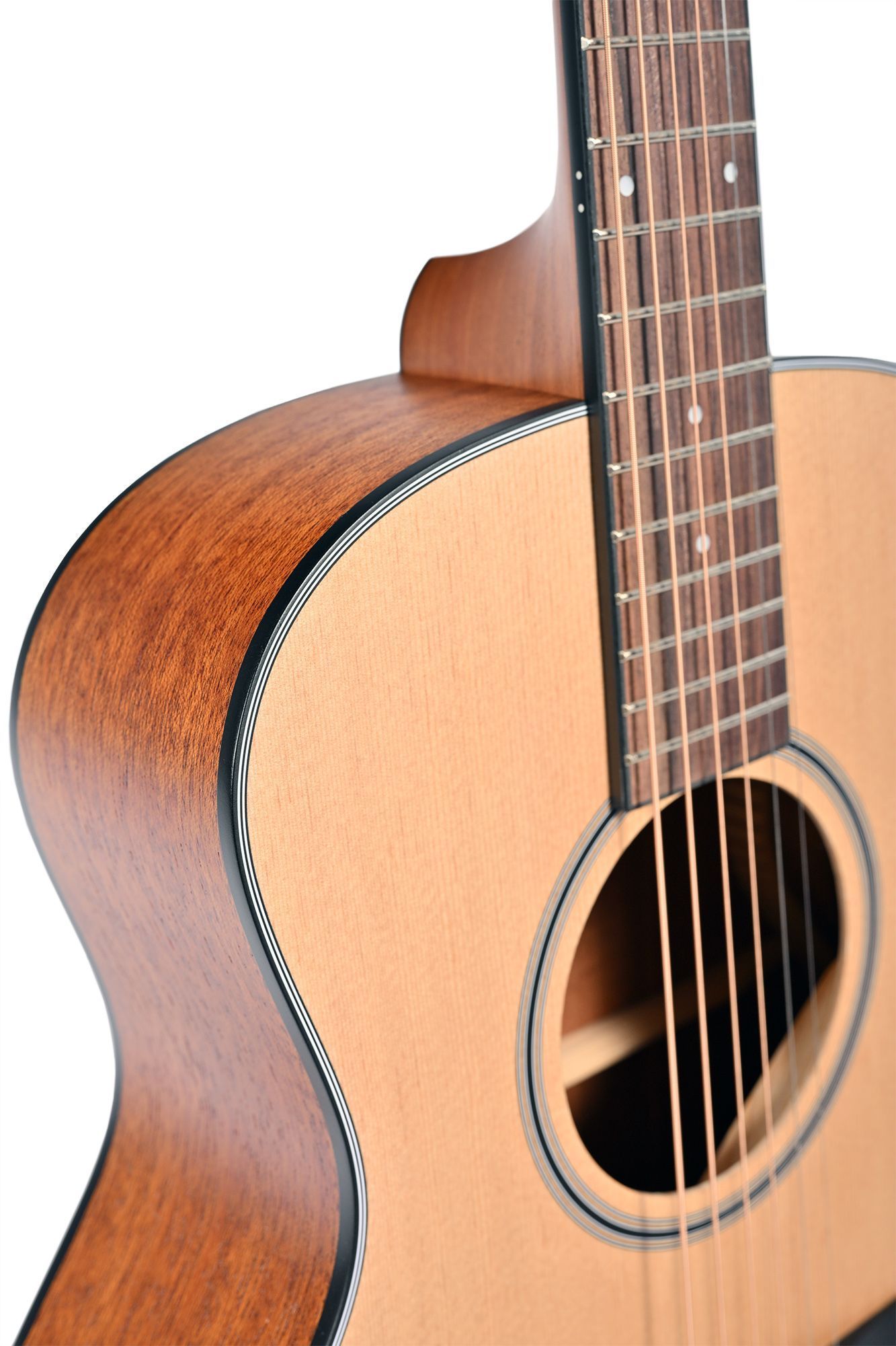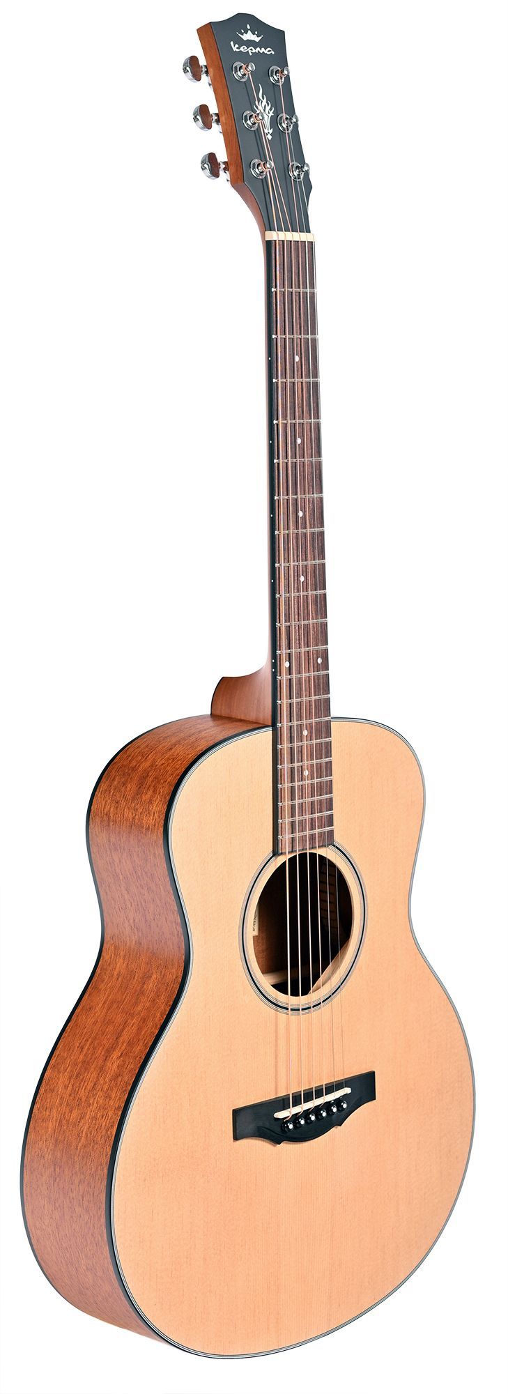 В гитаре Kepma ES36 используется самая популярная, проверенная временем формула древесины верхняя дека из ели, нижняя дека и обечайка из махагони. Для корпуса используется многослойная древесина она проще в обработке, абсолютно стабильна и неприхотлива к перепадам влажности и температуры. Такую гитару можно без опасений взять с собой на природу и в дорогу. Гриф гитары также выполнен из махагони, и имеет современный тонкий профиль C-Shape это значительно повышает удобство игры и упрощает процесс обучения. Накладка грифа выполнена из цельного китайского палисандра.