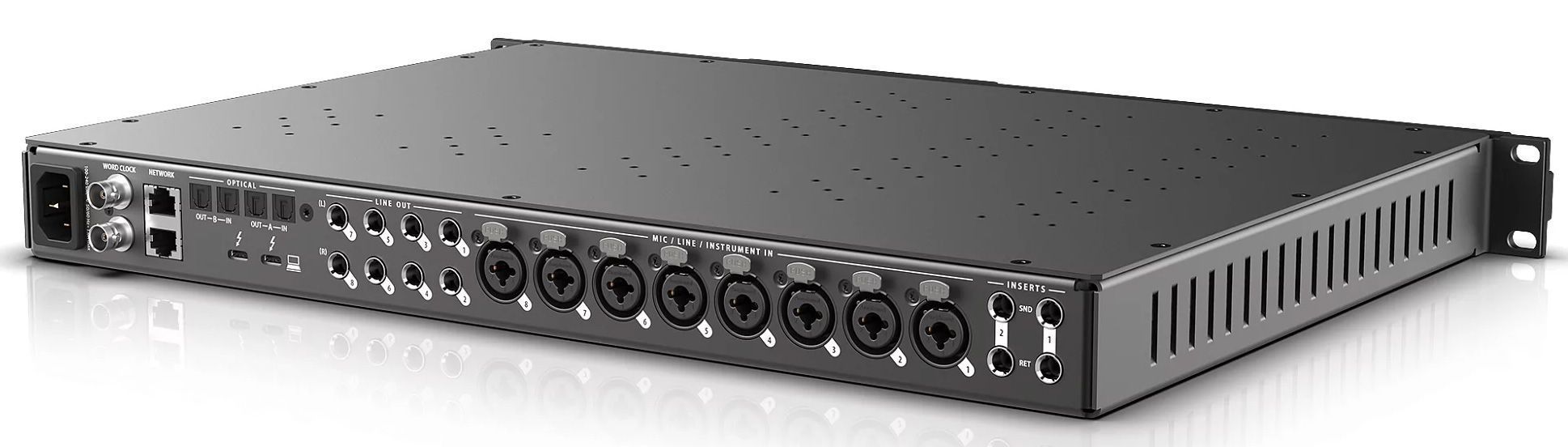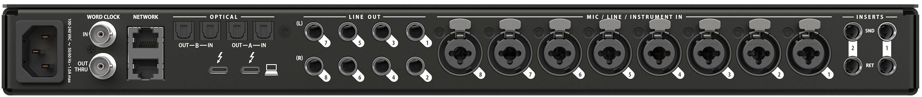 • Два банка оптических портов: подключение цифровых процессоров, микшеров и другого оборудования — 16 каналов ADAT при 44,1/48 кГц или 8 каналов S/MUX при 88,2/96 кГц. Банк A также поддерживает стерео TOSLink (оптический S/PDIF) до 96 кГц.