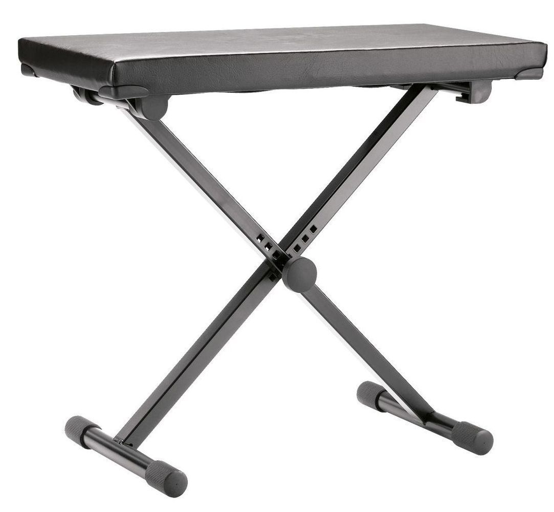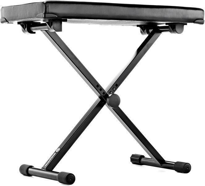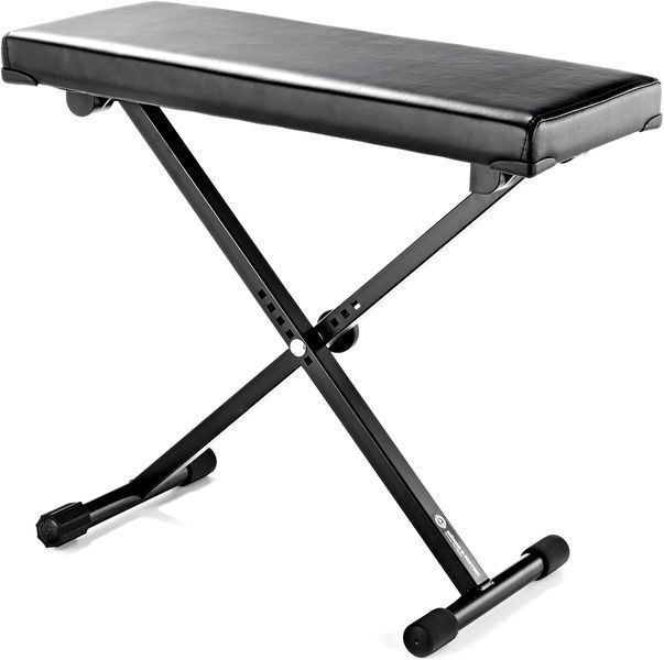 Удобная складная банкетка для клавишника с регулируемой высотой. Сиденье  покрыто искусственной кожей. Имеется регулируемый концевой колпачок для стабилизации стула на неровных поверхностях. Складывается для удобства транспортировки.