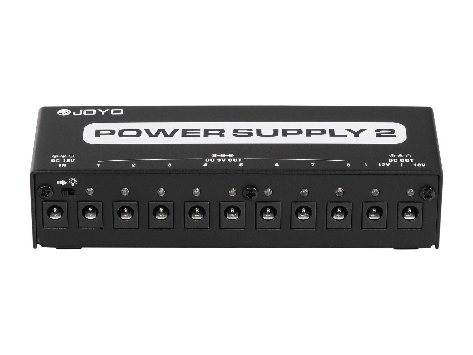 JOYO JP-02 – блок питания для педалей эффектов на 10 выходов с фильтром от сетевых наводок и раздельной защитой от короткого замыкания и перегрузки на каждом выходе. В блоке 7 выходов по 9 В/100 мА, чего будет достаточно для большинства аналоговых педалей, а 8-й выход выдает 500 мА. Еще 2 выхода выдают 12 В/100 мА и 18 В/100 мА. Все выходы изолированные и регулированные, у каждого выхода свой светодиодный индикатор режима работы, так что если какой-то выход будет перегружен или закоротит, то это будет видно, но при этом все остальные выходы будут работать. У блока питания продолговатый стальной корпус, подходящий для большинства педалбордов. В комплекте сетевой адаптер, 10 кабелей питания и 2 конвертера полярности.