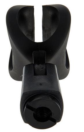 85050-000-55 - держатель микрофона, изготовленный из черного пластика и высококачественной эластичной резины, благодаря которой микрофон плотно вставляется и надежно удерживается. Применяется с микрофонами, имеющими коническую форму корпуса, с диаметрами 22-28 мм. Конструкция позволяет регулировать угол наклона микрофона. Устанавливается на микрофонную стойку посредством резьбового соединения 5/8 и 3/8 дюйма, для повышения прочности которого в пластиковое основание вмонтирована металлическая гайка с наружным рифлением, увеличивающим надежность ее сцепления с основанием.