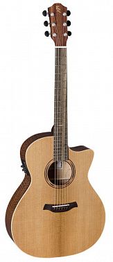 BATON ROUGE T22S/ACE – электроакустическая гитара с фирменным катавеем серии Auditorium. У нее прочная верхняя дека из массива немецкой ели с нижней декой и боковыми сторонами из огненного клена. Гриф также выполнен из клена, а накладка из сливы, бридж – сосна от BlackwoodTek. У гитары 20 ладов, верхний и нижний порожек выполнены из кости. Ширина верхнего порожка составляет 46 мм. Окантовка– кленовая. Используются струны Elixir, мензура – 630 мм. Колки – литые матовые хромированные с черными кнопками. Используется система звукоснимателей Baton Rouge BR2.1P.