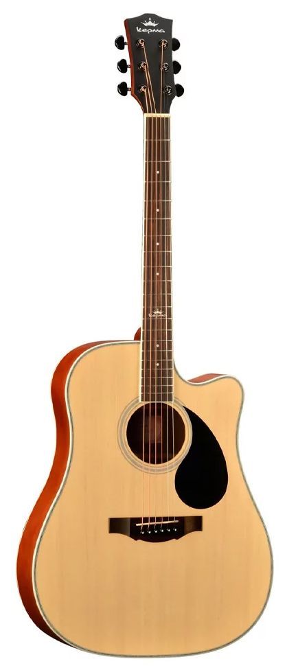 Электроакустическая гитара с корпусом Dreadnought, обладает мощным сбалансированным звучанием с глубокими низкими и ярко выраженными высокими частотами. Инструмент хорошо подходит как для игры пальцами, так и медиатором, и может использоваться в качестве сольного и аккомпанирующего инструмента. Верхняя дека гитары KEPMA D1CE сделана из ламината ели, делая звук ярким и звонким. Нижняя дека и обечайки выполнены из ламината махагони, который привносит в звук теплоту и объем. Низкая постановка струн и удобный гриф предлагают комфорт при игре, а вырез на корпусе обеспечивает легкий доступ к верхним ладам для исполнения пассажей и мелодий.