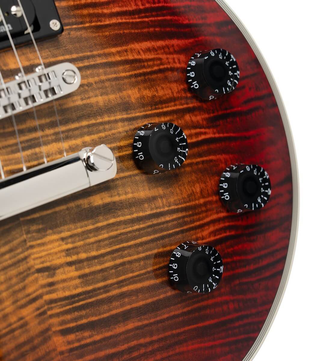 Корпус гитары выполнен из высококачественного красного дерева с кленовым топом толщиной 15 мм и эксклюзивным покрытием из волнистого клена. Такое сочетание материалов обеспечивает богатый, насыщенный звук с великолепной динамикой.