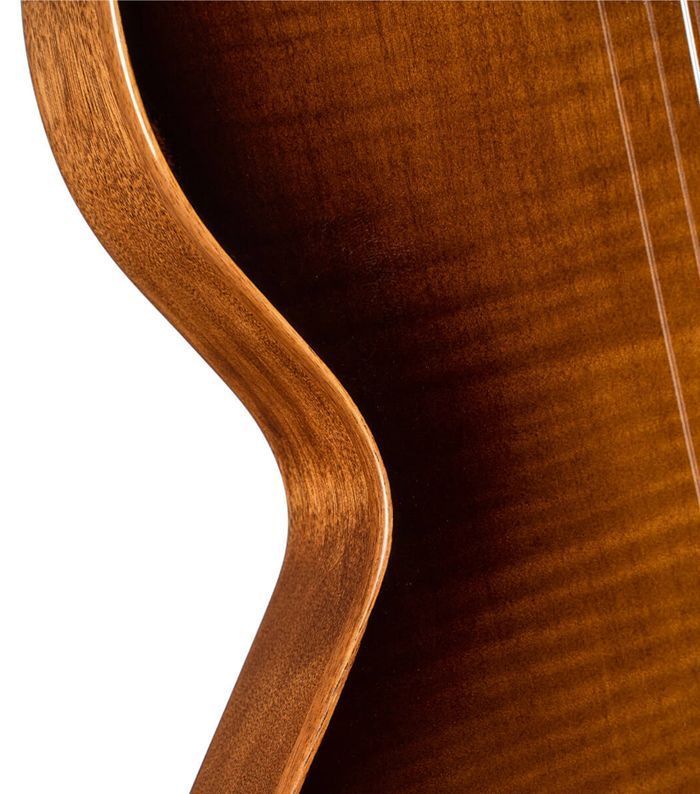 Верхняя дека из массива ели с отделкой из волнистого клёна на корпусе из красного дерева с полостями