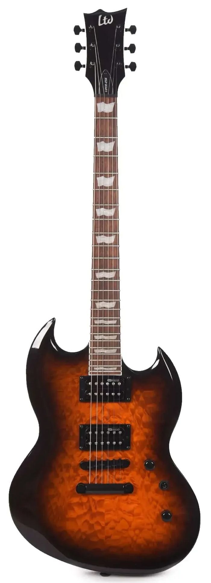 ESP LTD Viper-256 QMDBSB — это высококачественная электрогитара, которая идеально подойдёт для профессиональных музыкантов и любителей рок-музыки. Корпус гитары выполнен из массива махагони, что обеспечивает насыщенный и плотный звук. Вклеенный гриф из махагони и палисандра добавляет стабильности и прочности конструкции. Длина грифа составляет 24,75 дюйма, а количество ладов — 24, что позволяет гитаристам легко играть сложные мелодии и аккорды. ESP LTD Viper-256 QMDBSB оснащена двумя мощными хамбакерами ESP LH-150, которые обеспечивают яркий и пробивной тон. Бридж Tonepros Locking TOM и хвост гарантируют надёжное крепление струн и стабильность строя гитары. Чёрная фурнитура придаёт гитаре стильный и современный вид. Цвет гитары — Dark Brown Sunburst, который является классическим и универсальным вариантом. Он подходит для любого стиля музыки и хорошо сочетается с другими элементами гардероба музыканта. ESP LTD Viper-256 QMDBSB — это отличный выбор для тех, кто ищет качественную и надёжную электрогитару с мощным звуком и стильным дизайном.