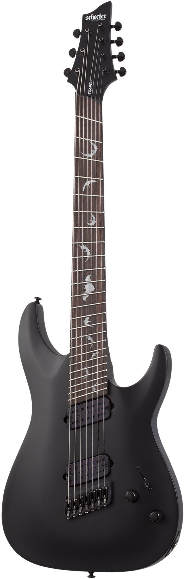 Серия гитар Damien имеет внешний вид и звук, подходящий для рок исполнения. Украшенные часто копируемой инкрустацией "летучая мышь", эти высококлассные гитары вооружены потрясающими Schecter Diamond Heretic звукоснимателями и поставляются в 6, 7 и 8 струнных вариантах. А зловещий матовый черный цвет с черной окантовкой утонченно добавляет "зла". Мультимензурная гитара SCHECTER DAMIEN-7 MS SBK характеризуется грифом, выполненным из клёна с армированными стержнями из углеродного волокна, колками Schecter, звукоснимателями Schecter Diamond Heretic. Корпус гитары изготовлен из красного дерева. За формирование звука отвечает громкость, тон с Push-Pull и 3-позиционный переключатель звукоснимателей.