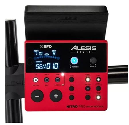 Набор включает профессиональную стальную раму, поддерживающую настраиваемую высоту, и модуль Nitro Pro с 36 пресетами барабанных наборов (классические, современные и BFD). Модуль оснащен Bluetooth для стриминга аудио, а также USB/MIDI для подключения к компьютеру. Встроены функции записи, метроном и обучающие режимы, что делает комплект подходящим как для начинающих, так и для опытных музыкантов.