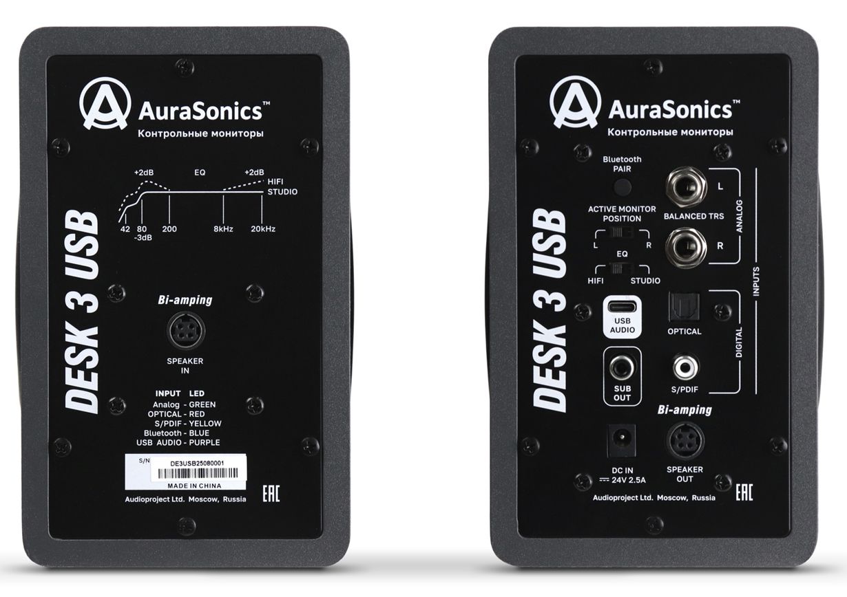 Контрольные мониторы AuraSonics DESK 3 USB являются активными акустическими системами и предназначены для прослушивания музыки, для просмотра фильмов, а также для контроля звучания в процессе создания музыки или при монтаже видеоконтента. Модель AuraSonics DESK 3 USB прекрасно подойдёт для любых задач, где требуется качественное и точное звучание. Мониторы относятся к классу микромониторов с диаметром НЧ динамика 3" и предназначены в первую очередь для настольного использования рядом с компьютером в условиях недостатка свободного пространства. Для размещения на столе в комплекте имеются две стойки, позволяющие разместить мониторы под оптимальным углом. Компактность моделей достигается примененем пассивных резонаторов, которые, в отличие от фазоинверторов, не занимают внутренний объём акустических систем.