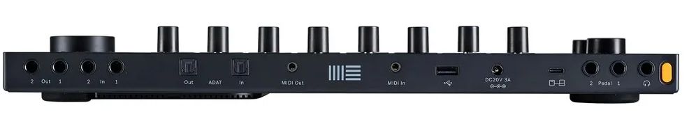 • Разъемы: стерео выход, выход для наушников, два аудиовхода (2x моно или 1x стерео), два выхода для педали экспрессии, которые также можно использовать как четыре CV-выхода с помощью двух дополнительных Y-кабелей, MIDI-вход/выход minijack (тип A) и ADAT-вход/выход
