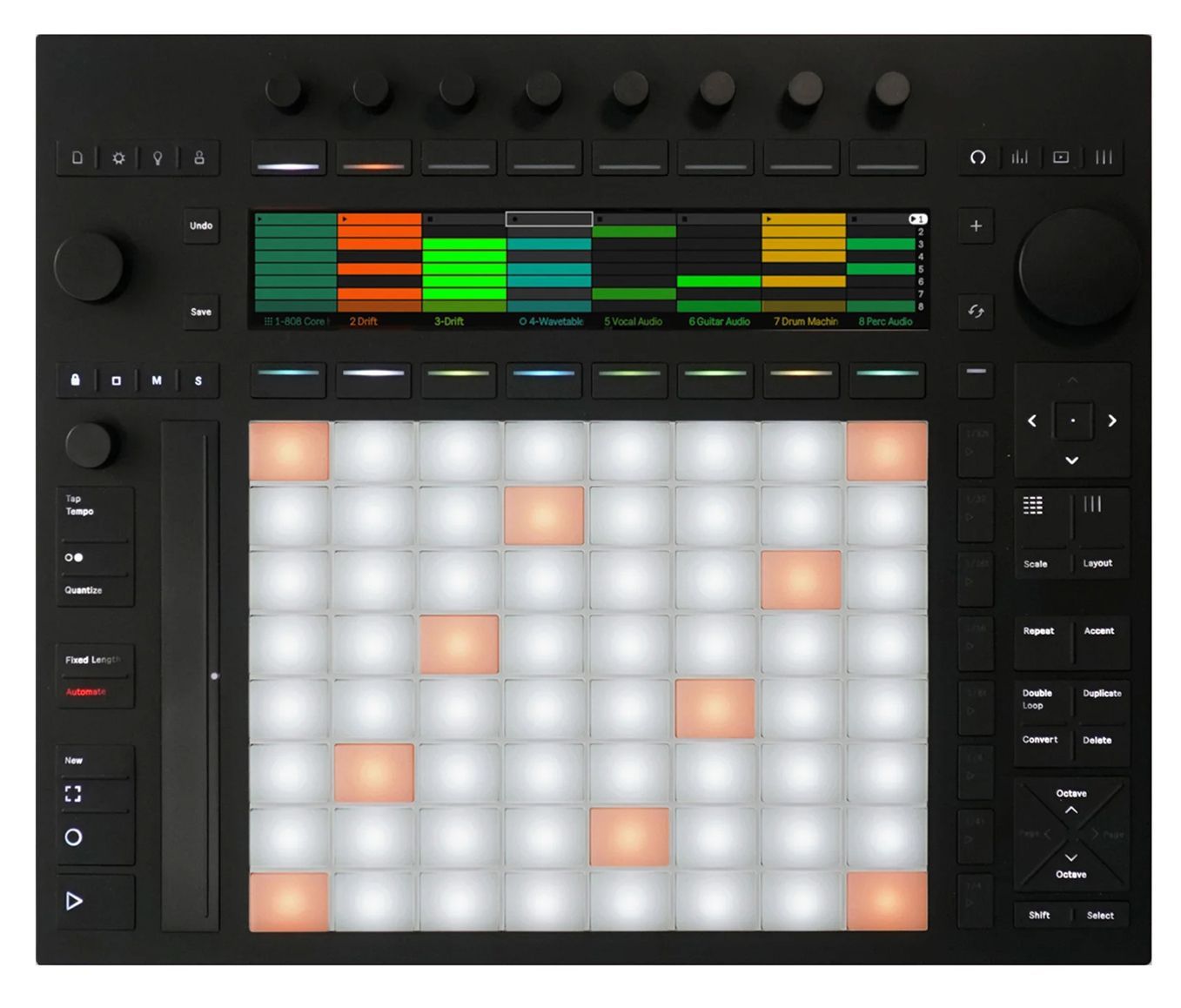 Управление: 64 пэда с поддержкой MPE, 8 энкодеров, 3 бесконечных энкодера с возможностью клика, слайдер для мод-колеса и питч-бенда