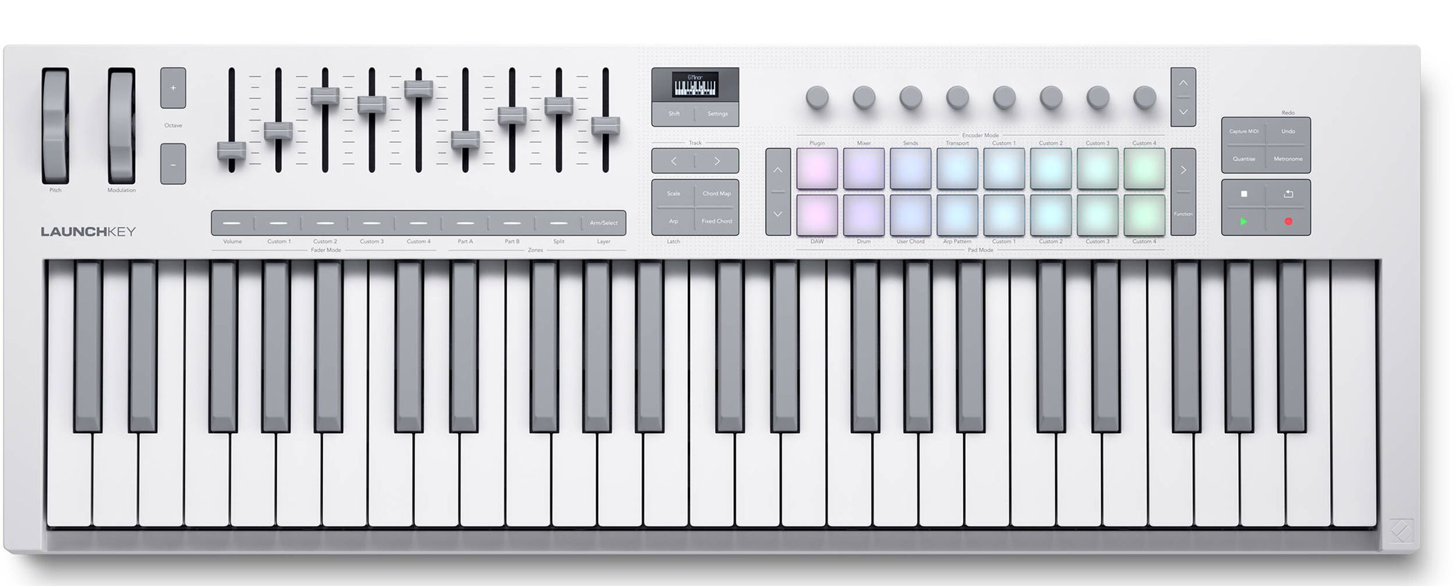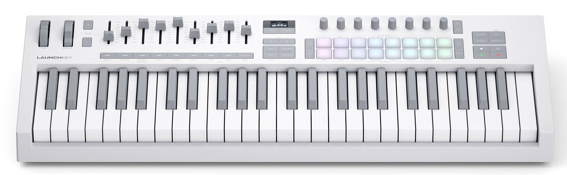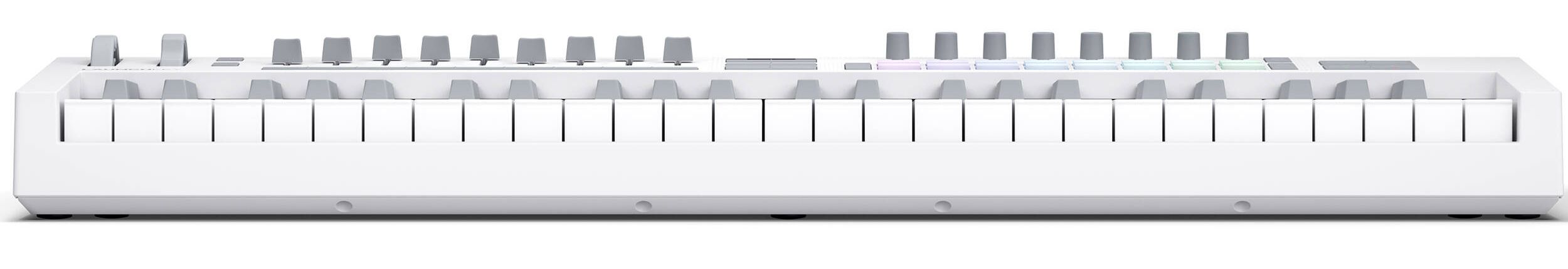 Launchkey 49 White — это мощный DAW контроллер в элегантном и современном дизайне. Он оснащен 49 полувзвешенными белыми и серыми клавишами waterfall-стиля, восемью энкодерами, девятью фейдерами и 16 чувствительными к скорости нажатия пэдами ударных, инструментов и запуском клипов. Кроме того, режимы Chord и Scale работают с OLED-дисплеем, чтобы вы всегда были в курсе событий.