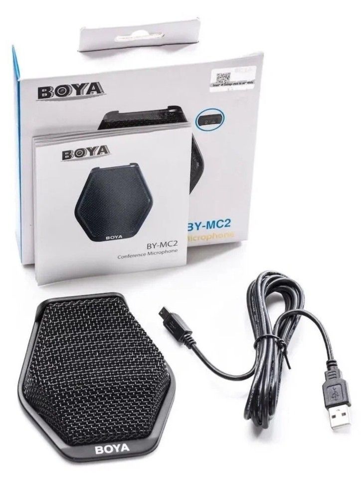 Микрофон Boya BY-MC2 для настольной установки удобен для проведения конференций за счет плоской конструкции и небольших размеров. Представленная модель конденсаторного типа имеет суперкардиодную направленность. Корпус устройства выполнен из пластика. Частотный диапазон работы микрофона Boya BY-MC2 составляет 50–20000 Гц, а чувствительность -47 дБ. Модель имеет проводное соединение с компьютером или акустической системой, для чего оснащена USB-разъемом и кабелем.