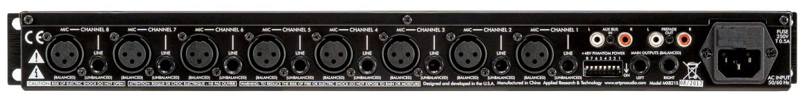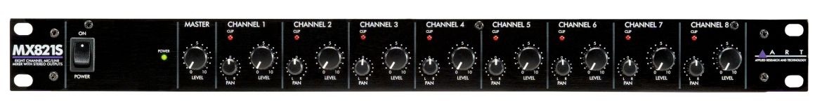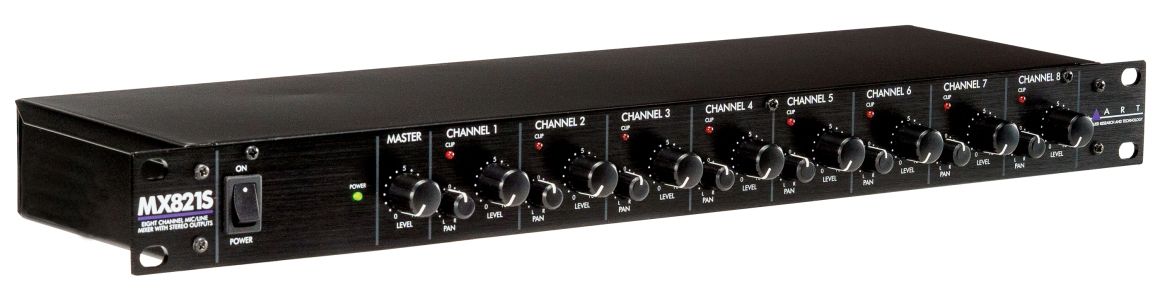 MX821S — восьмиканальный рэковый стереомикшер. Каждый канал оснащён микрофонным входом XLR с переключаемым фантомным питанием, небалансным линейным входом 1/4" и независимыми регуляторами Level и Pan. Линейный вход можно преобразовать в Direct выход с помощью внутренних джамперов. Регулятор Master Level управляет балансными выходами 1/4". Также предусмотрен выход pre-fader и вход AUX со стереоразъёмами RCA для объединения нескольких устройств в цепочку, добавления дополнительного стереоисточника или отправки микса на записывающее устройство. Оснащенный наибольшим количеством микрофонных предусилителей рэковых микшеров ART, MX821S может служить как автономное решение или дополнять существующий сетап.