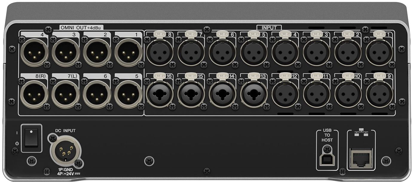 Локальные входы/выходы: 16 микрофонных/линейных входов (12 XLR + 4 выхода XLR/TRS Phones Combo) и 8 выходов (XLR)