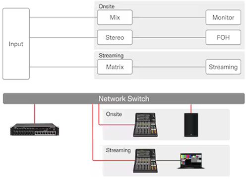 Благодаря стерео и матрицам, маршрутизация аудиосигнала обеспечивает высокую степень свободы и позволяет раздельно микшировать аудиосигнал для использования на месте и потоковой передачи.