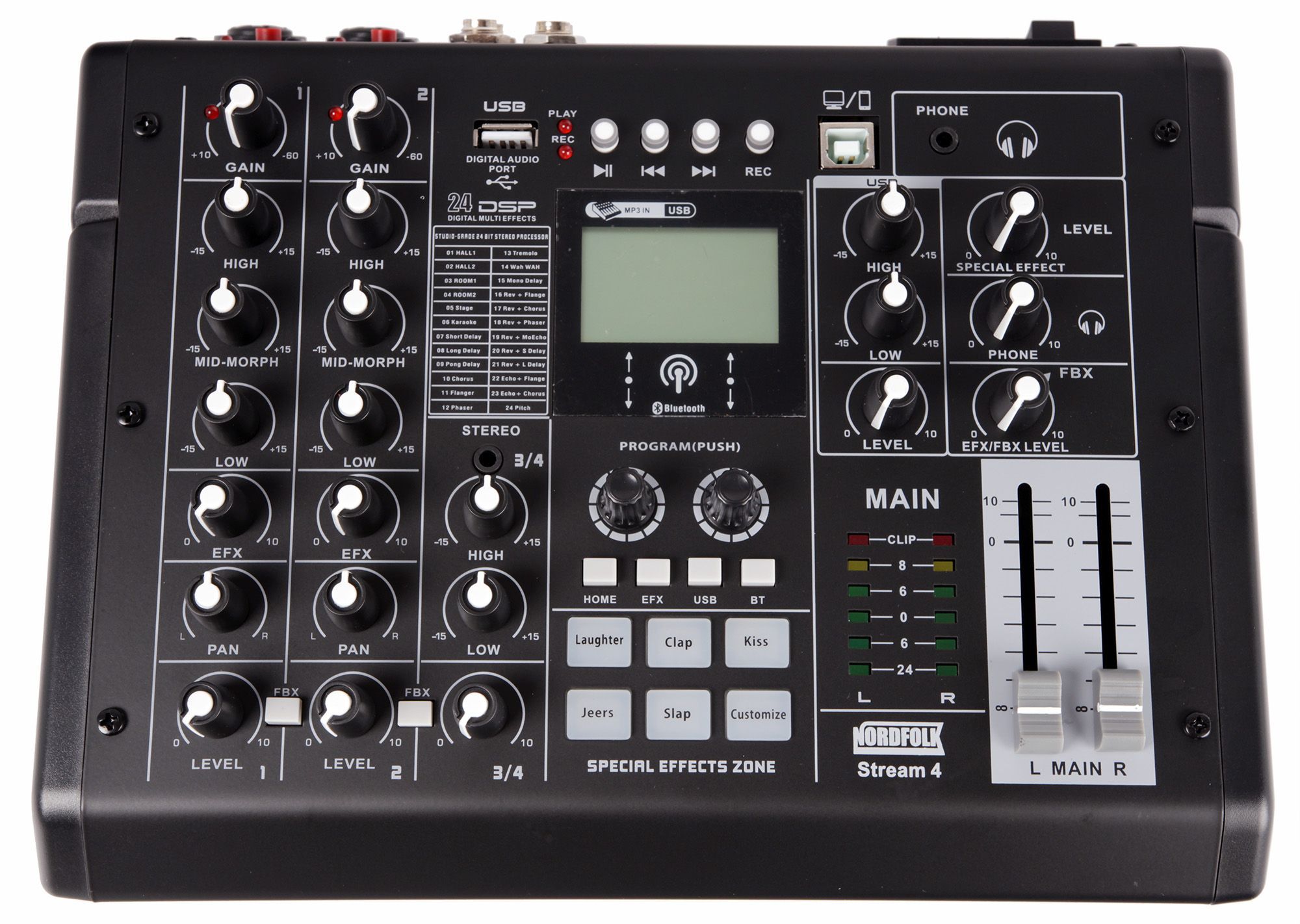 Компактный и стильный микшерный пульт для широкого круга задач где необходимо сведение звукового сигнала: от онлайн трансляций и стриминга до домашней студии, школьного актового зала или домашнего концерта. STREAM 4 имеет 2 входных канала с комбинированными разъемами XLR/1/4" для подключения микрофонного или инструментального кабеля. Дополнительно есть стерео канал для подключения внешних аудиоустройств (телефоны, планшеты и тд) или синтезатора. 3-х полосный эквалайзер на 1 и 2 канале и 2 полосный на стереоканале стерео. Встроенный DSP процессор с блоком отдельных звуковых эффектов и MP3 проигрыватель с входом USB и возможностью записи. Приемник Bluetooth для подключения аудиосигнала и выход на наушники для мониторинга.