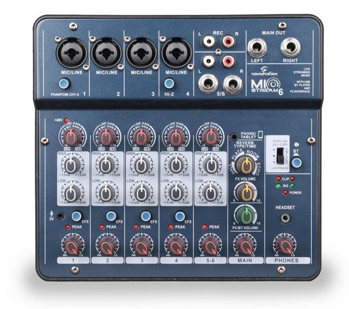 Микшерный пульт оснащен до микрофонными/линейными входами с фантомным питанием 48 В, выделенным входом 5 В для конденсаторных микрофонов, возможностью подключения по Bluetooth и высококачественным цифровым процессором эффектов с четырьмя настраиваемыми предустановками.