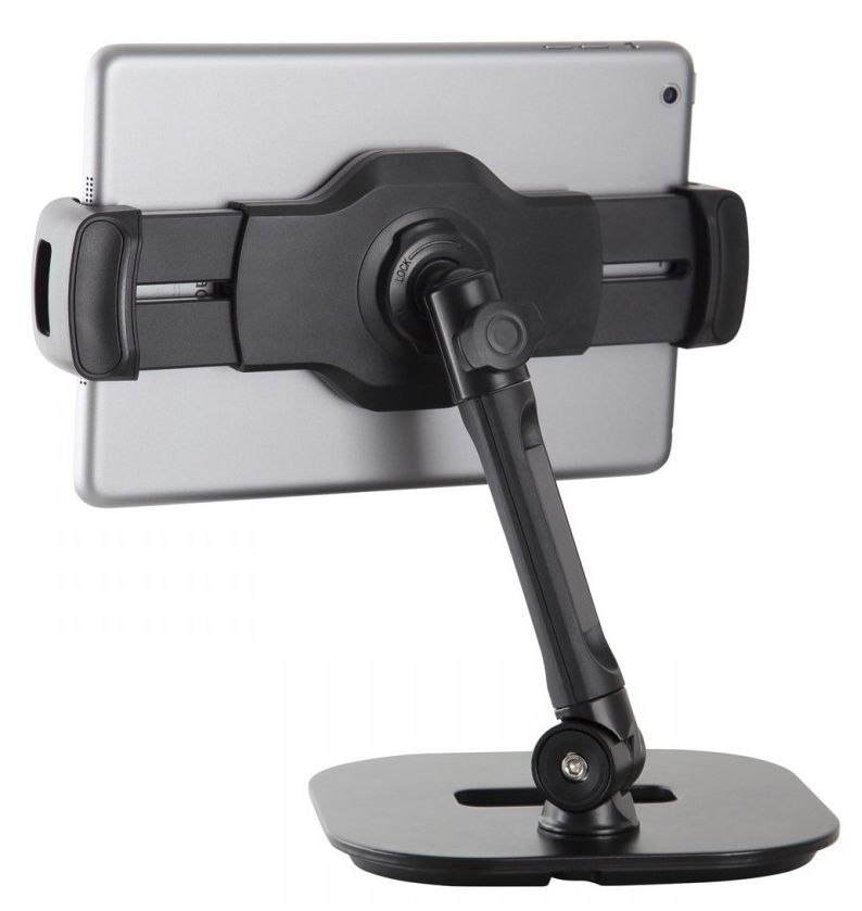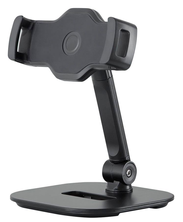 K&M 19800-000-55 универсальная настольная подставка для смартфона и планшета с нескользящим покрытием, диапазон зажима 130-240 мм, основание состоит из 4 нескользящих ножек и имеет отверстие для кабеля, держатель вращается на 360 градусов, цвет черный.