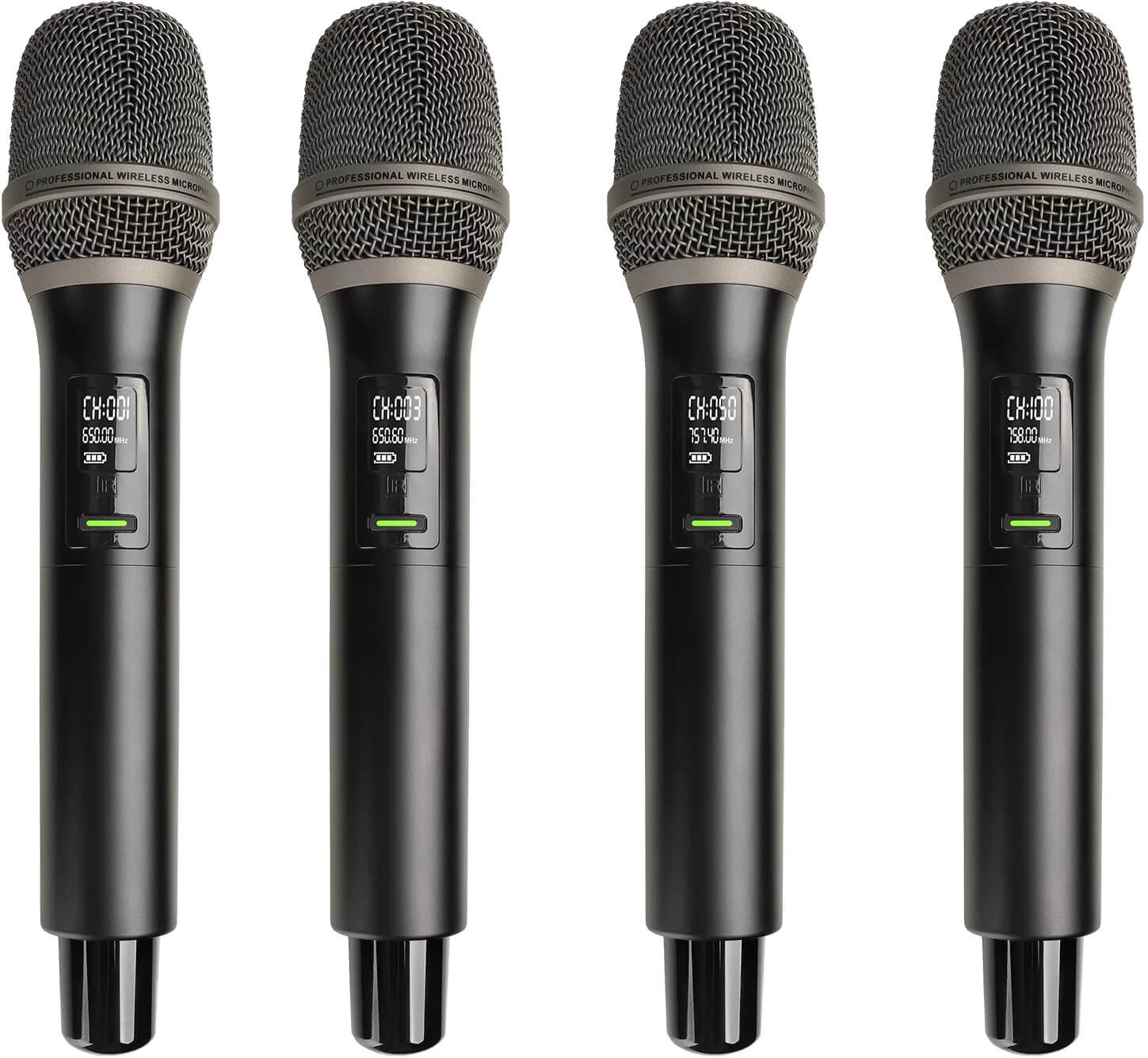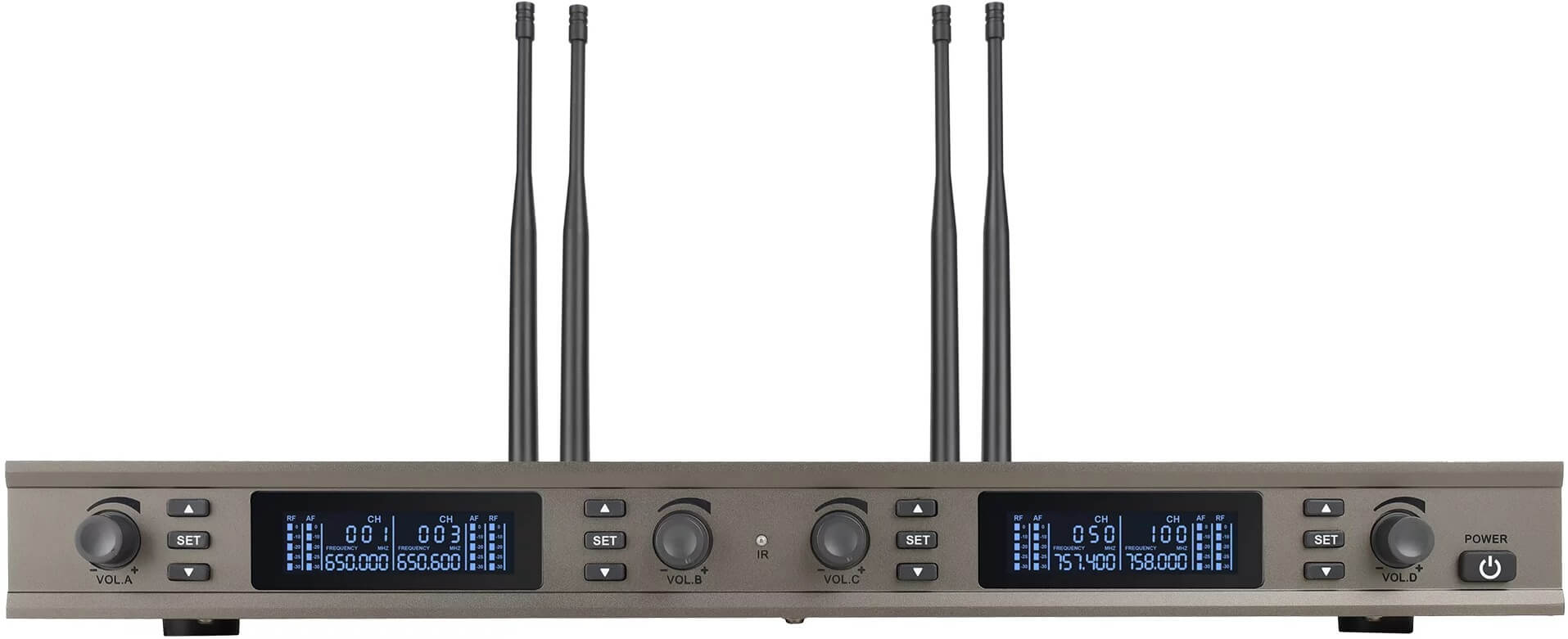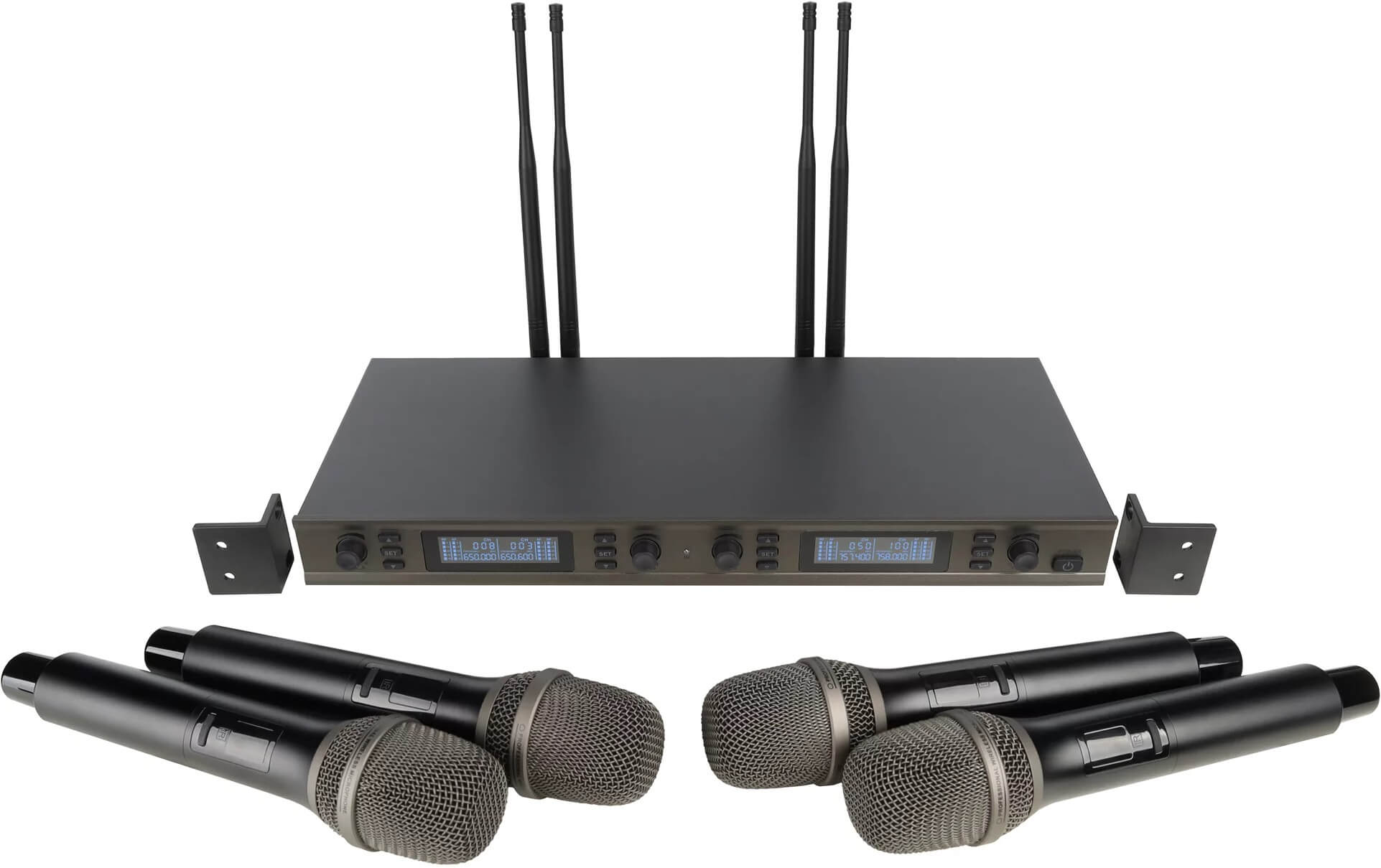 Тип: Четырехканальная беспроводная цифровая вокальная радиосистема профессионального уровня с DSP, состоящая из четырех ручных микрофонов и четырехканального приемника