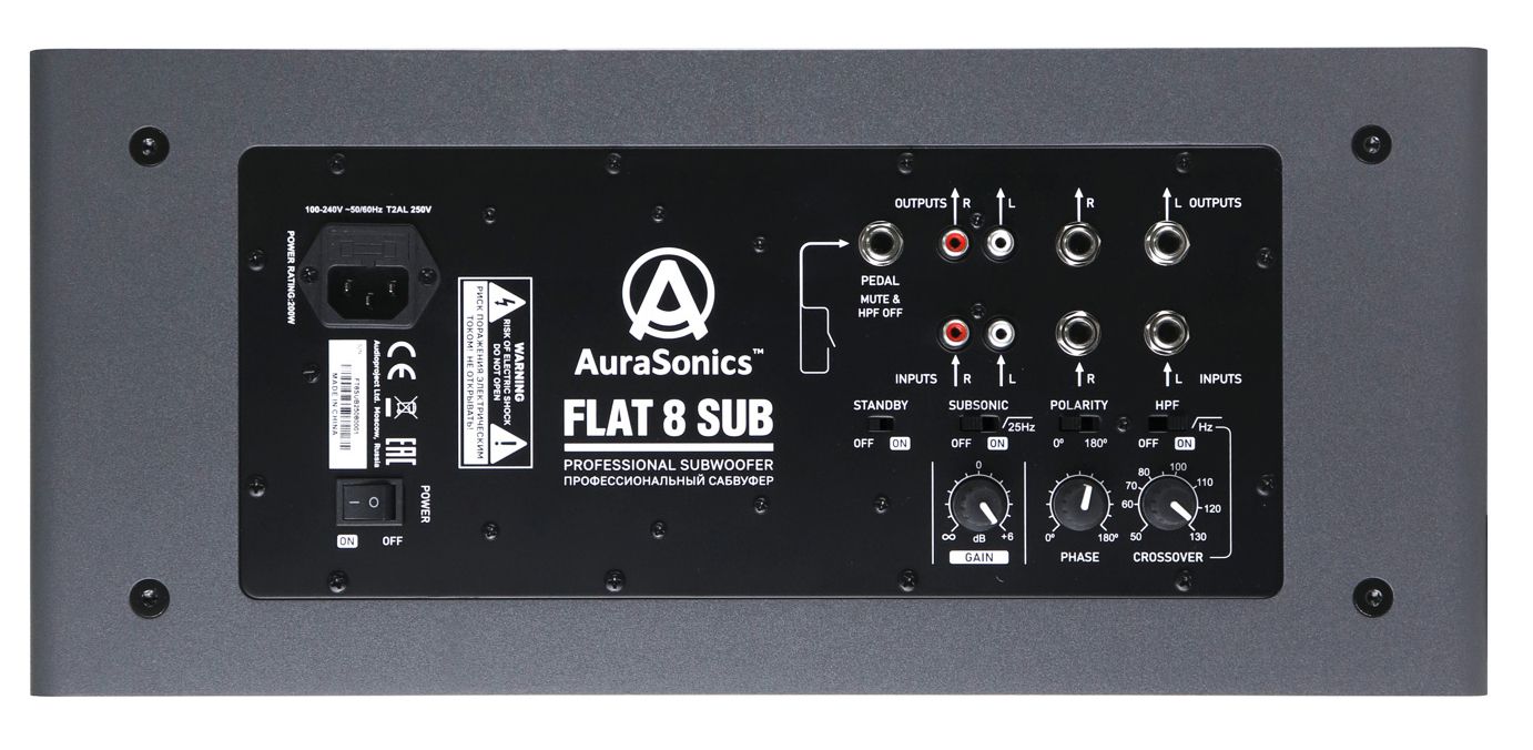 Модель AuraSonics FLAT 8 SUB является профессиональным активным сабвуфером, который предназначен для работы совместно с компактными мониторами или акустическими системами для воспроизведения низкого частотного диапазона. Для соединения с профессиональной техникой модель оснащена балансными входами и выходами Jack-TRS 6,3 мм, а для работы с бытовыми устройствами – небалансными входами и выходами RCA. Сабвуфер отлично подойдёт как для профессиональной работы, так и для прослушивания музыки в составе Hi-Fi комплектов или в системах домашнего кинотеатра.