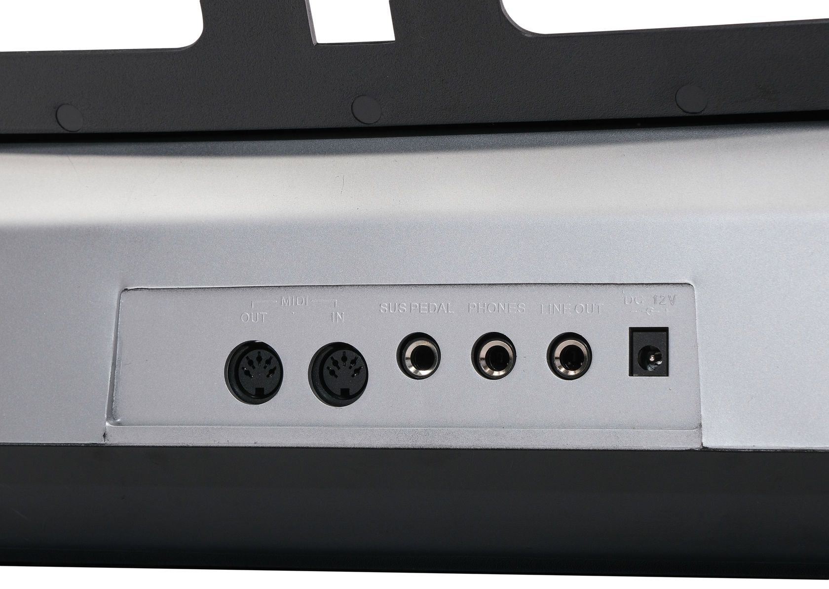 Подключения: разъем питания, разъем подключения наушников, разъем линейного выхода, разъем подключения педали сустейна, входной/выходной разъем MIDI.