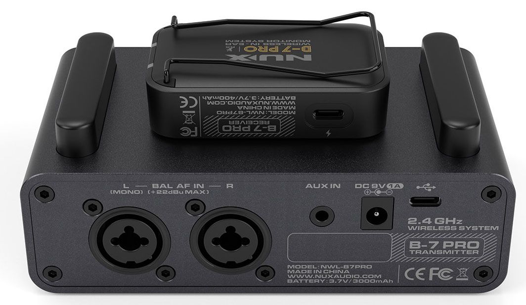 NUX B-7 PRO — это персональная беспроводная система ушного мониторинга с автоматической настройкой, частотой вещания без помех 2,4 ГГц и высококачественным стереозвуком 24 бит 48 кГц. Радиус действия составляет до 50 метров (160 футов) с очень низкой задержкой передачи данных.