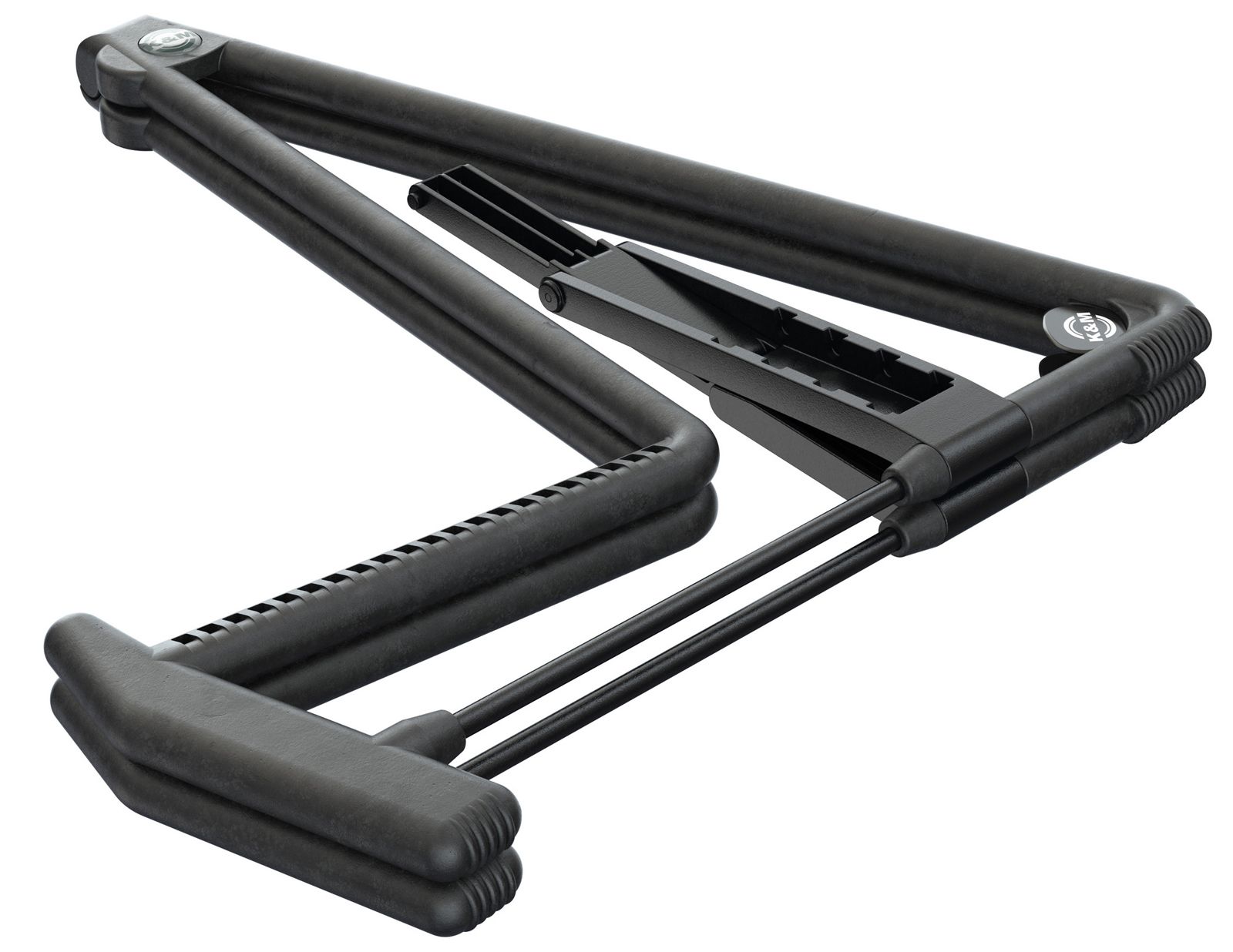 Обновленная версия классической стойки Heli 2 стала еще более удобной. Прочная и надежная, K&M 17580-014-55 сделана из стали, а дополнительная защита инструмента достигается за счет использования специального не царапающего резинового покрытия в местах соприкосновения частей гитары со стойкой. Высота стойки 33 см. Данная модель имеет инновационную регулируемую перекладину, за счет чего ширина может варьироваться от 185 мм до 230 мм. Стойка подходит для установки гитар разного размера, в том числе гитар с безголовым грифом, а также таких инструментов как виолончель или валторна. Вес стойки менее килограмма, а для хранения и перевозки она может быть легко сложена в плоскую конструкцию, которая практически не занимает места (толщина сложенной стойки всего 3 сантиметра). Кроме того, эта модель снабжена специальной защелкой для транспортировки в сложенном состоянии. Для удобства музыканта стойка оборудована по бокам двумя дополнительными отделениями (ячейками) для хранения медиаторов. Два медиатора поставляются в комплекте.