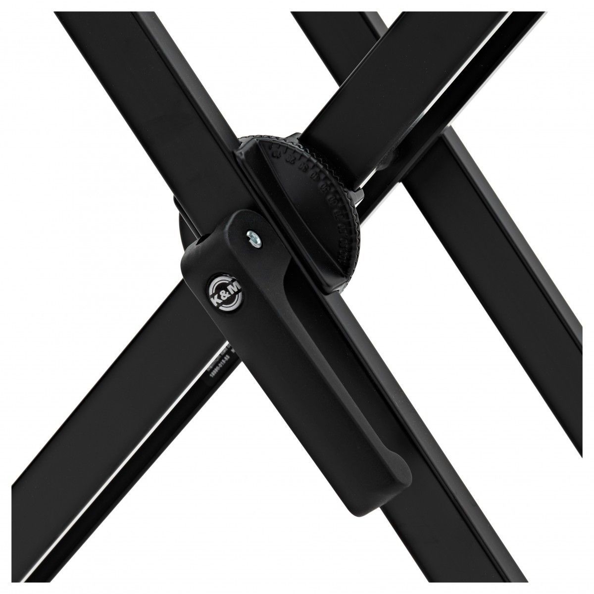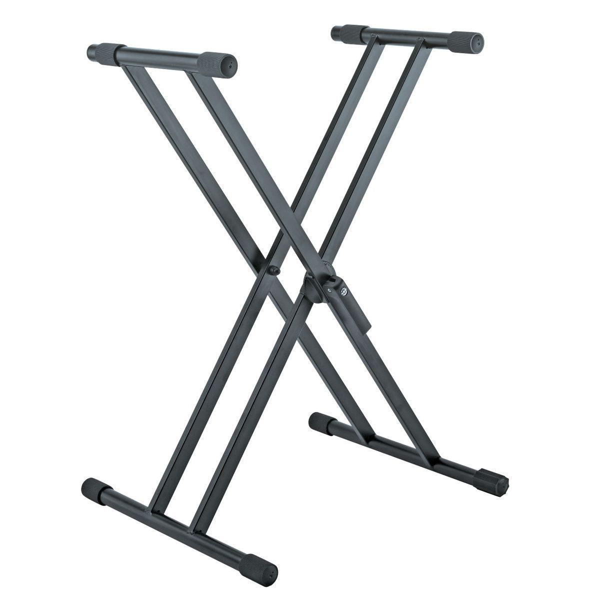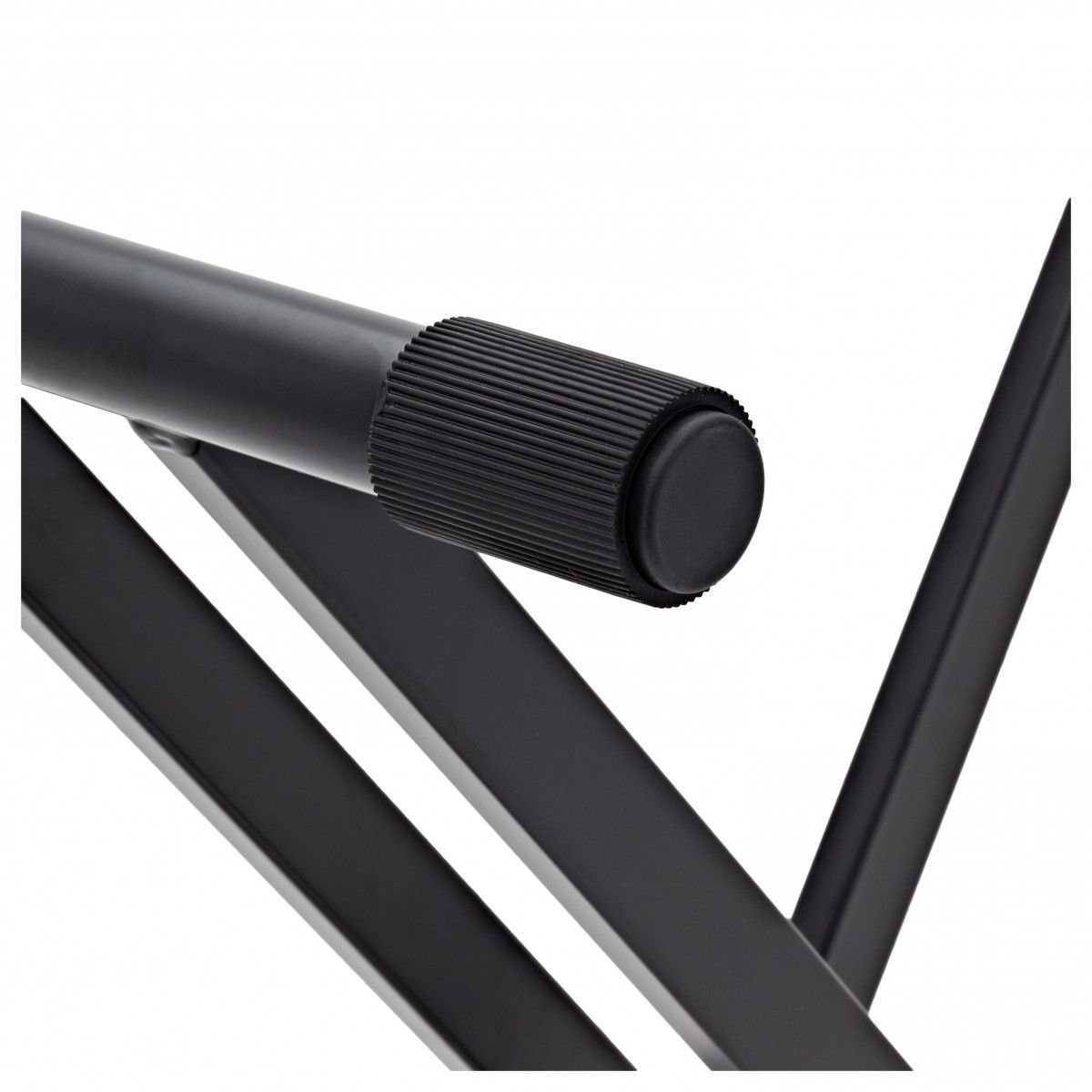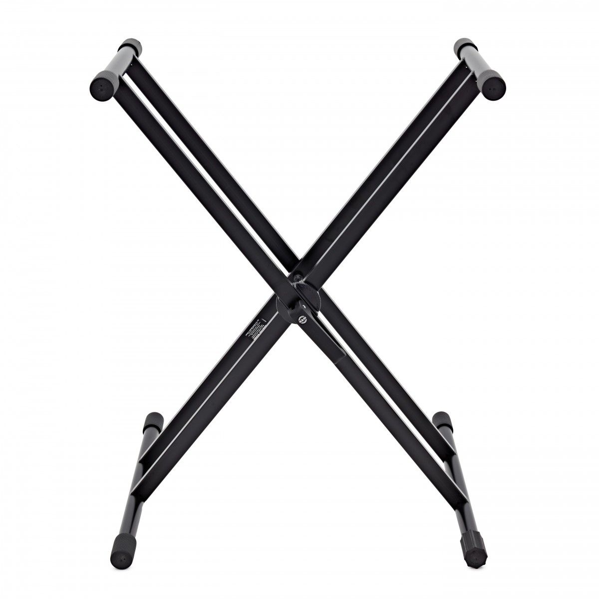 Прочная стойка с двойной рамой - "Rick". Эргономичный зажимной механизм позволяет складывать и раскладывать стойку легко и быстро. Крепкий металлический узел обеспечивает регулировку высоты с шагом в 5°. Такой короткий интервал позволяет наиболее комфортно отрегулировать высоту инструмента.