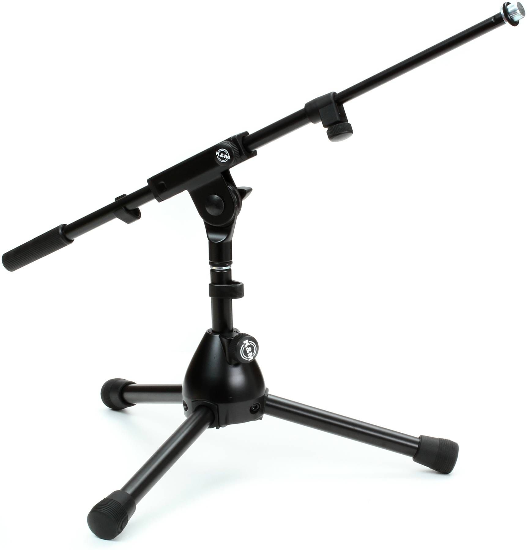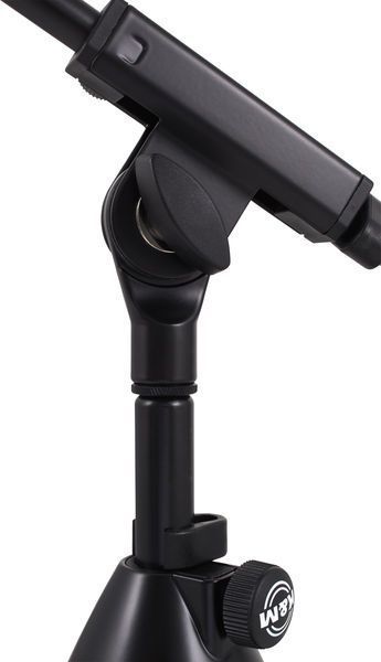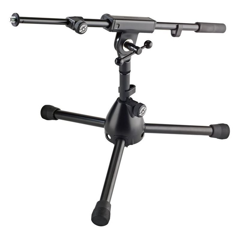 Верхняя часть низкой микрофонной стойки имеет дополнительное плече с несколькими фиксаторами длины и положения в виде нескольких зажимных и стопорных винтов. На некоторых моделях стоек также используется дополнительная стопорная защелка. Угол наклона плеча можно регулировать и фиксировать при помощи специального зажимного элемента. Длина дополнительного плеча может изменяться в пределах от 425 мм. до 725 мм. Все элементы стойки легко регулируются одним человеком. В качестве прочных фиксаторов положения и длины выдвигающихся частей используются прочные стальные зажимные и стопорные винтовые механизмы при помощи которых можно быстро изменить высоту стойки и зафиксировать ее положение. Все элементы крепления с легкостью закручиваются руками без использования дополнительного оборудования.