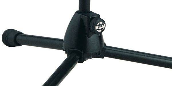 Опорный механизм стойки для микрофона K&M 25950-300-55 выполнен в виде телескопической конструкции с тремя опорными, складными ногами, каждая из которых оснащена нескользящей подошвой из резины (каучука). Треножное основание стойки изготавливается из прочных, массивных металлических труб из специального сплава металла с алюминием. Верхнее крепление выдвигающихся частей оснащены блокировочными, зажимными и стопорными винтами.