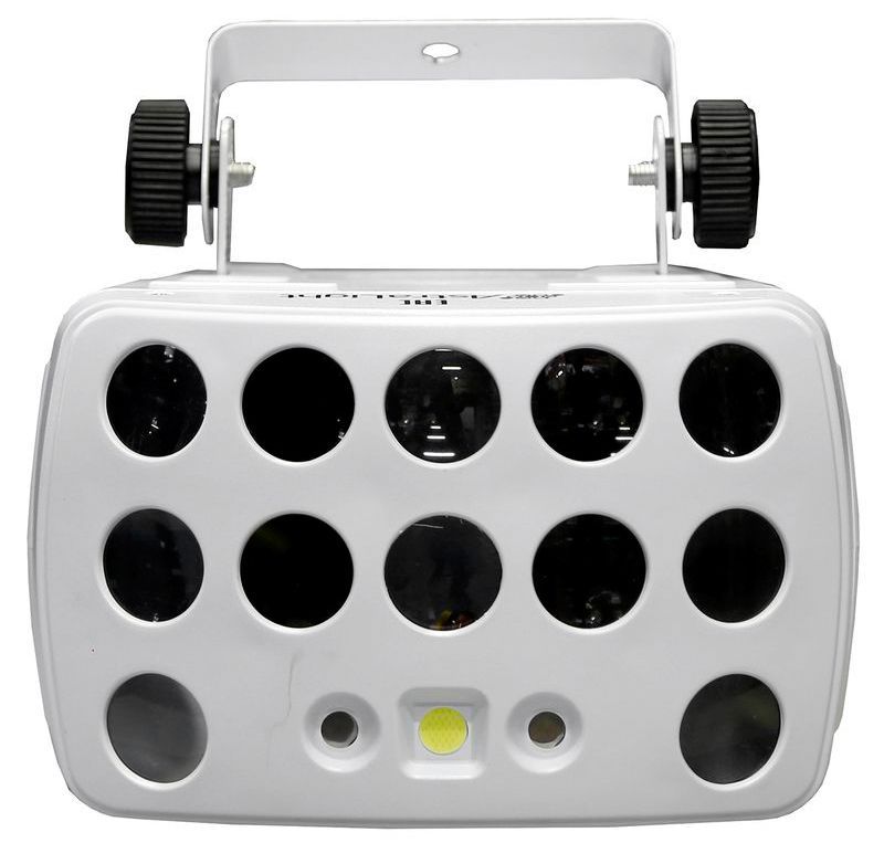Многофункциональный световой прибор для дискотек 3 в 1, совмещающий в себе красный и зелёный лазеры, стробоскоп и LED-эффекты. В режиме звуковой активации может работать в такт музыки, также в авторежиме или по DMX. Прибор хорошо подходит для работы в небольших кафе, барах и домашних вечеринок.