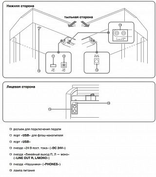 Интерфейс: выходы для наушников, педали и блока педалей, USB