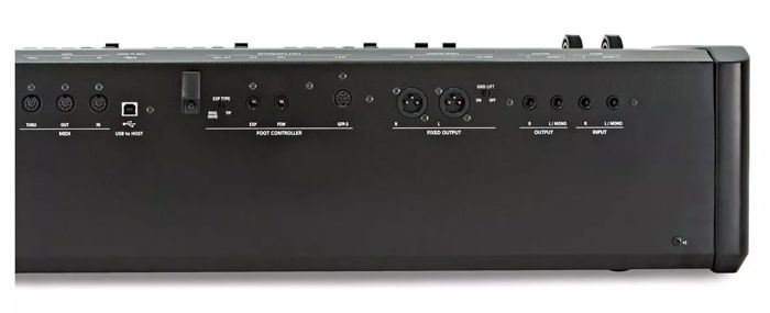 Разъемы: Выход: 1/4” Линейный (Л/Моно, П), XLR (Л, П) с возможностью отключения “земли”, Наушники. Вход: 1/4” Линейный. MIDI и USB: MIDI IN, MIDI OUT, MIDI THRU, USB to Host, USB to Device. Педали: DAMPER/SOSTENUTO/SOFT (для GFP-3), FSW, EXP с переключателем EXP TYPE. Питание: AC IN
