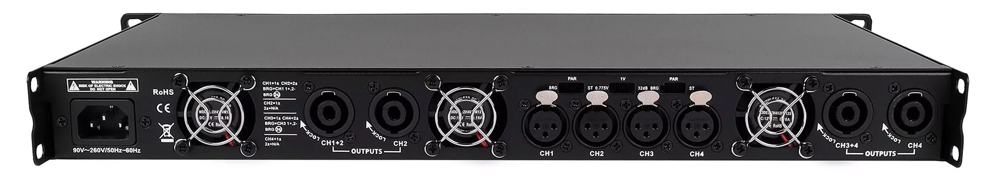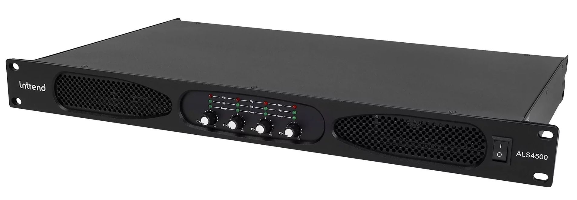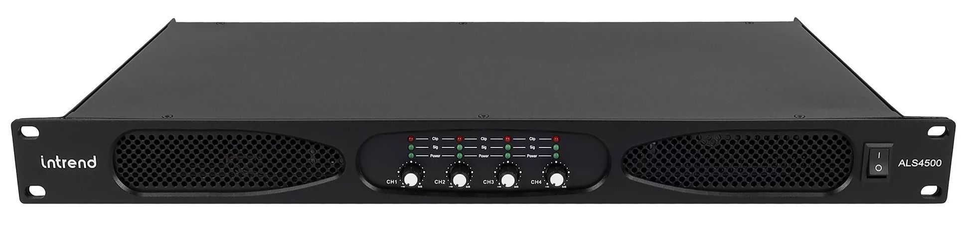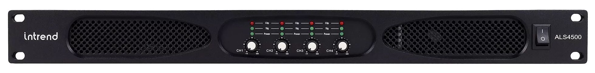 ALS 4500 это четырёхканальный низкоомный усилитель мощности в компактном 1U корпусе. На передней панели усилителя находятся регуляторы громкости для каждого канала, индикаторы уровня сигнала, перегрузки и защиты.