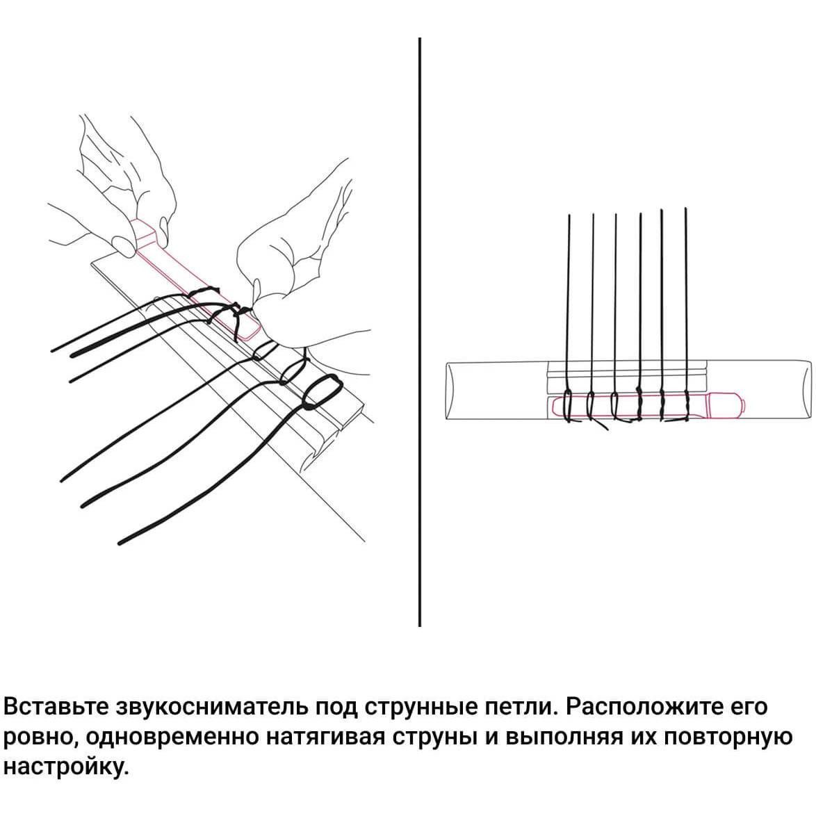 Пьезоэлемент надежно крепится к блоку крепления струн с помощью только натяжения струн. Установка быстрая, безопасная и полностью обратимая. Ваша гитара остается оригинальной и не подвергается никаким изменениям, включая сверление, резку или склеивание.